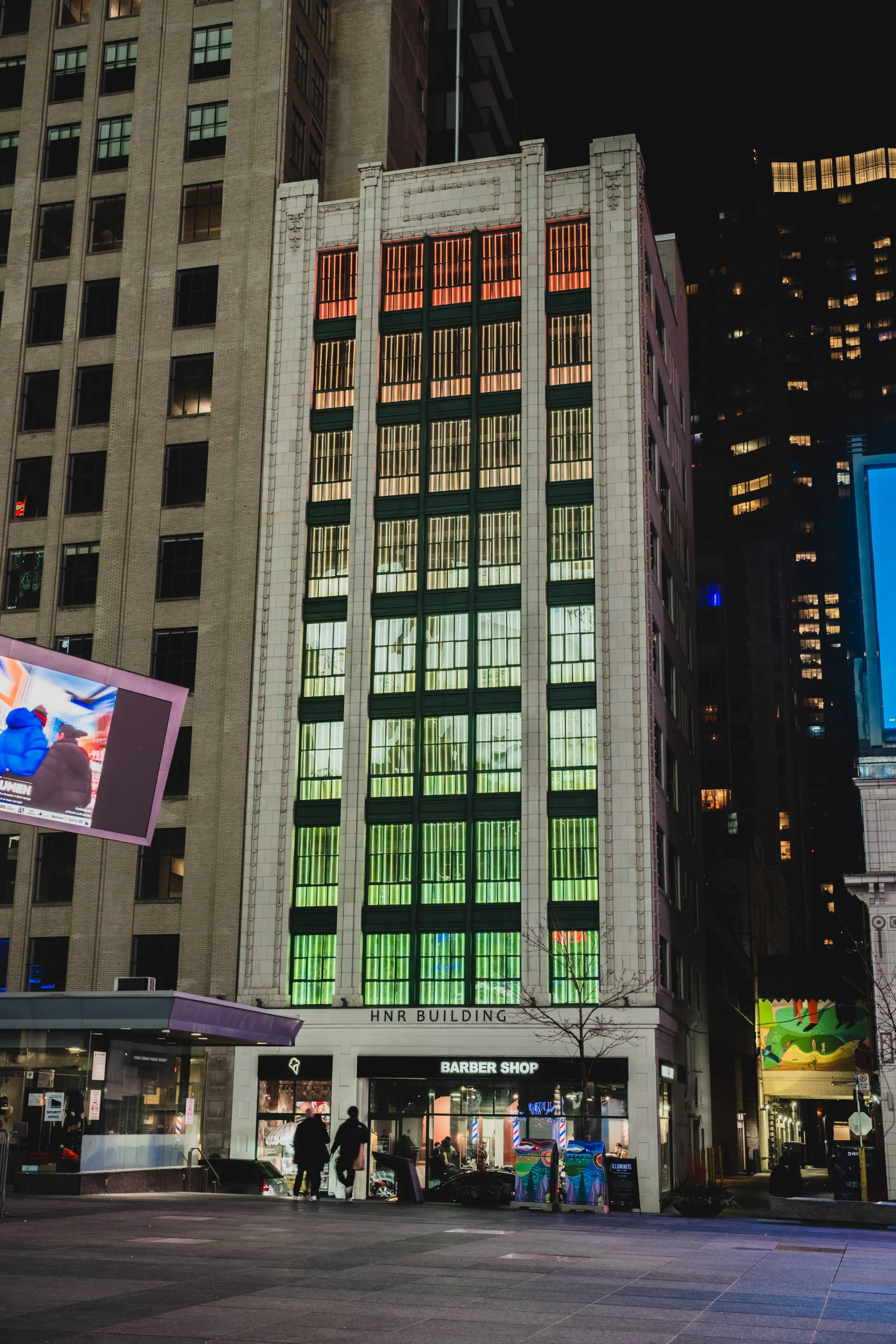 Created by MattCreative, installation that lit up all the windows of the front facade of this building located at HNR Properties at 19-21 Dundas Square (Yonge-Dundas Square). The interior of the windows were covered completely by grids of programmable LEDs, that rotated different digital images throughout the night